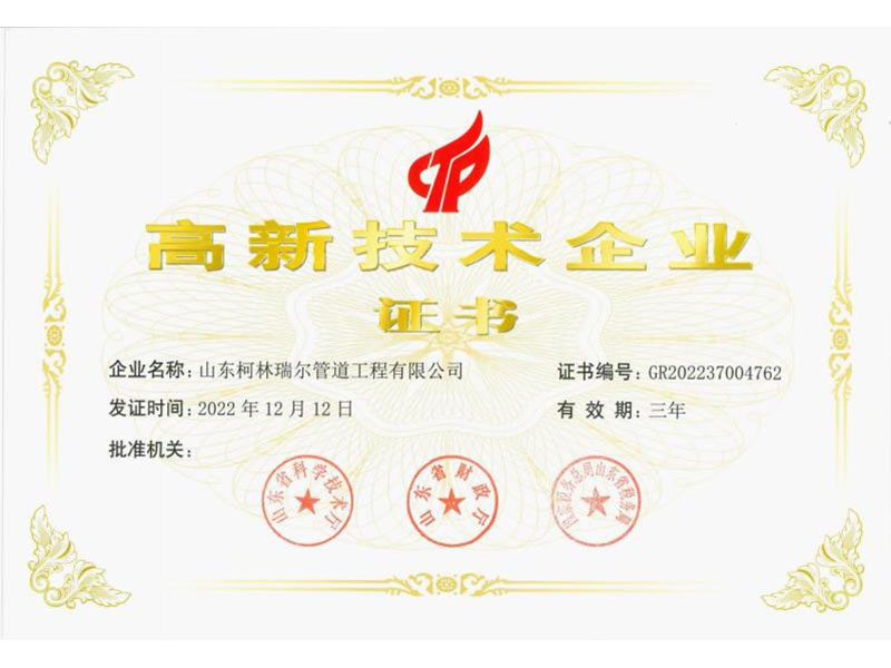 山東柯林瑞爾管道工程有限公司是國家級高新技術企業,水資源節約與保護產業創新聯盟理事單位。公司與中國石油大學(華東)、北京化工大學等多家知名院校和國家實驗室建立了長期密切的合作關系。公司被評為“山東省專利明星企業”,“質量信得過單位”,“企業信用AAA級單位”,山東省“專精特新”企業。